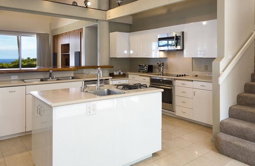As you enter the main house, you’ll be awed by the two-story vaulted ceilings, gleaming Koa hardwood floors and open concept great room. Ceiling fans, plus the constant tradewinds, provide cooling air flow in the great room area. The expansive living room space offers seating for a group, centered around a flat screen TV. The dining table seats up to 12 guests. The large kitchen is fully equipped to provide anything from simple snacks to full meals for the group. For guests that prefer to spend much of their vacation outdoors, the great room leads directly to the west-facing deck that spans the rear of the house, providing outdoor dining and lounging options.