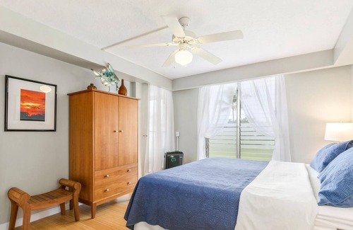 Our Condo has 2 bedrooms and 2 beautifully remodeled baths and a large covered lanai. It is perfect for enjoying your vacation to the max. The condo is furnished in a very comfortable contemporary style and located on the second floor of a three-story building with parking conveniently in front. All rooms have floor-to-ceiling louvered windows to allow the wonderfully silky ocean and mountain breezes to surround you. Additionally, all rooms have remotely controllable ceiling fans, including the lanai, for extra comfort.