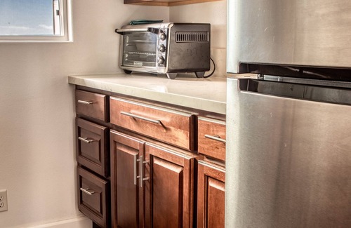 The studio has a fully equipped Kitchenette, with all you need to create your own meals. microwave, coffee pot, electric tea kettle, single induction cook top, blender and toaster.
