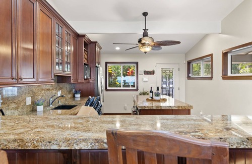 The granite-topped island is the heart of the kitchen, surrounded by stainless steel appliances and warm wood cabinetry. With a coffee maker, rice cooker, blender, and full suite of cookware, the space is well-equipped for both casual breakfasts and island-inspired feasts.