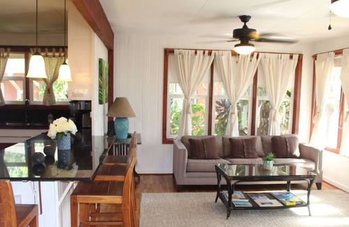 Three bedroom, three bath home in the heart of historic Haleiwa town! Set off the main road and behind a large gate for privacy. Walk to shops, restaurants and Haleiwa Beach/Harbor. The home is surrounded by tropical fruit trees in a tranquil setting that affords privacy yet is convenient to all that the North Shore offers visitors! Quiet, peaceful and spacious! Minutes to swimming, surfing, snorkeling and hiking! Fast wifi, split A/Cs, full-sized washer & dryer, large Smart TV.