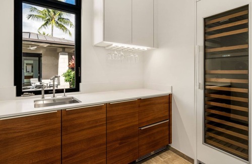Inside, the gourmet kitchen is equipped with top-tier Miele appliances, a built-in coffee maker, and a temperature-controlled wine storage system, ensuring your culinary and beverage needs are met with ease. With multiple refrigerator drawers and a walk-in pantry, there’s ample space for stocking everything from gourmet ingredients to local Hawaiian delicacies.