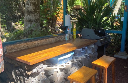 A large shared outdoor kitchen and barbecue are just steps away. This gorgeous jungle environment features lush greenery and a symphony of coqui frogs, parrots, pheasants, goats, wild pigs, geckos, and colorful local roosters! You may hear or see any of them at any time, adding to the adventure and the natural charm of the place—and all this just 20 minutes from Kona!
