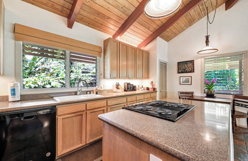 Keywords: Hanalei, Kauai, North Shore, Guesthouse, House, 2 bedroom, Sleeps 4, Riverfront, Waterfront, Secluded, Private, Romantic, Family, Beach, Paddle, Garden, Nature, Retreat, Cottage, Peaceful, Cozy, Air-conditioned, Full Kitchen, Washer, Dryer, WiFi, Parking, Quiet, Instant Booking.
