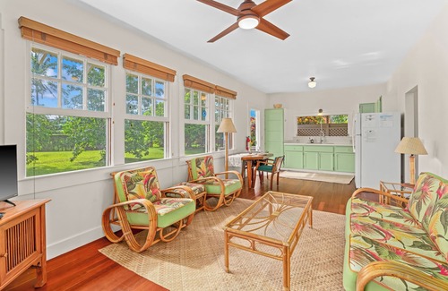 Charming 1 bedroom, 1 bath, vintage Hawaiian style cottage, located just off the main road with hedges providing privacy. A private and romantic location with palm trees surrounding the expansive yard. This serene setting is perfect for a honeymoon or romatic getaway. High Speed WiFi Internet Service. A Weber Charcoal BBQ Grill, Outdoor Shower, Covered Lanai with day bed for lounging, a very quick walk to Hanalei Bay or to restaurants and shopping in Hanalei town. King bed in the roomy bedroom. Newly painted interior and cabinets have given this sweet cottage new life.