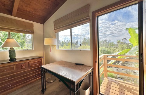 The spacious primary bedroom invites you to unwind on a luxurious king-size bed, complete with a private en-suite bathroom featuring a shower. Enjoy the convenience of a double closet, TV with Chromecast, and a dedicated workspace. Step out onto your private balcony to take in breathtaking views of the sunken garden, highlighted by terraced lava stone walls and lush tropical fruit trees.