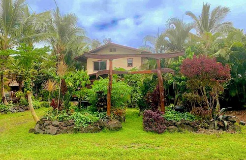 Discover this charming ground floor Studio apartment in this 3 unit House, just 1.5 / 2 kilometers away from the famous, clothing optional Kehena Black sand beach where wild dolphins often swim with you, near quaint Pāhoa town. This welcoming apartment features 1 queen bed, full kitchen with freezer & fridge, a shower, toilet and a hair dryer for your convenience. Toiletries, soaps and Linens provided. With fiber optic WiFi, shared weight lifting dumbbells, and a washer/dryer machine available on the backyard porch/lanai, guests can enjoy a fabulous short or long term stay in this cozy space. About 45 minutes from Hilo, 2.5 hours from Kailua Kona, 1 hour to Volcano National Park. Explore the idyllic and rustic beauty of the Puna Coastline. Take a dip in the Geothermal Hot Ponds at Poho'iki / Issac Hale Park. Explore the 2018 eruption with a Fissure 8 Tour in Leilani Estates. Attend numerous farmer's markets throughout the week. Sunday Funday on the Neighborhood Lawn often with vendors, drumming and fire spinning. The property itself borders hundreds of acres of state land, all wild, native Ohia Lehu'a Forest, the first tree to sprout after a lava flow covers the earth and an epiphyte, like an orchid! We look forward to hosting you at our place near one of the most volcanically active places on earth!