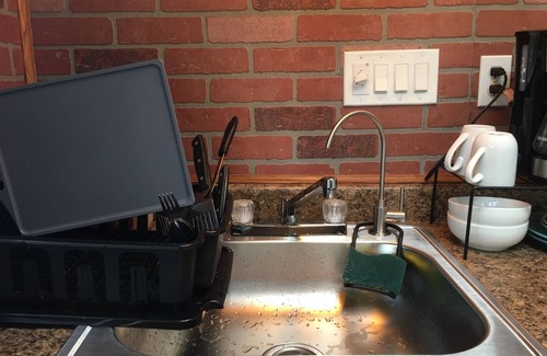 Kitchen space has coffee maker , microwave ,refrigerator (is in the living room right by the TV) ,utensils, plates and cups. Its a tiny house so everything what is inside are all necessary for your stay.