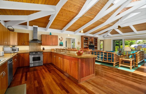 Experience the magic of Kauai’s North Shore at this beautifully upgraded home, featuring koa wood and bamboo accents, vaulted ceilings, and breathtaking ocean and mountain views. Nestled on a quiet street just a short walk from one of the island’s most iconic beaches and surf spots, you’re perfectly located near Hanalei Pier, Ching Young Village, Lumaha‘i, Tunnels (Makua), Ke‘e Beach, Na Pali Coast tours, and more.